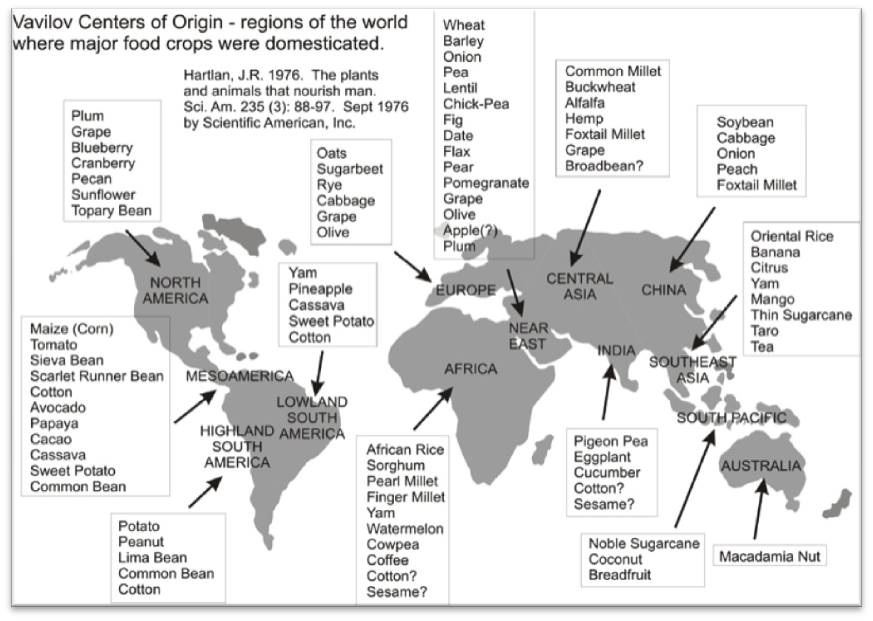 I am not sure that all of these are correct. For example, I thought apples were from central Asia rather than the Middle East. But the point is true that our food crops and lifestock were domesticated in many regions, and much of the progress of the world has come from the diffusion of high yield crops to new areas where they supported population and economic growth.
